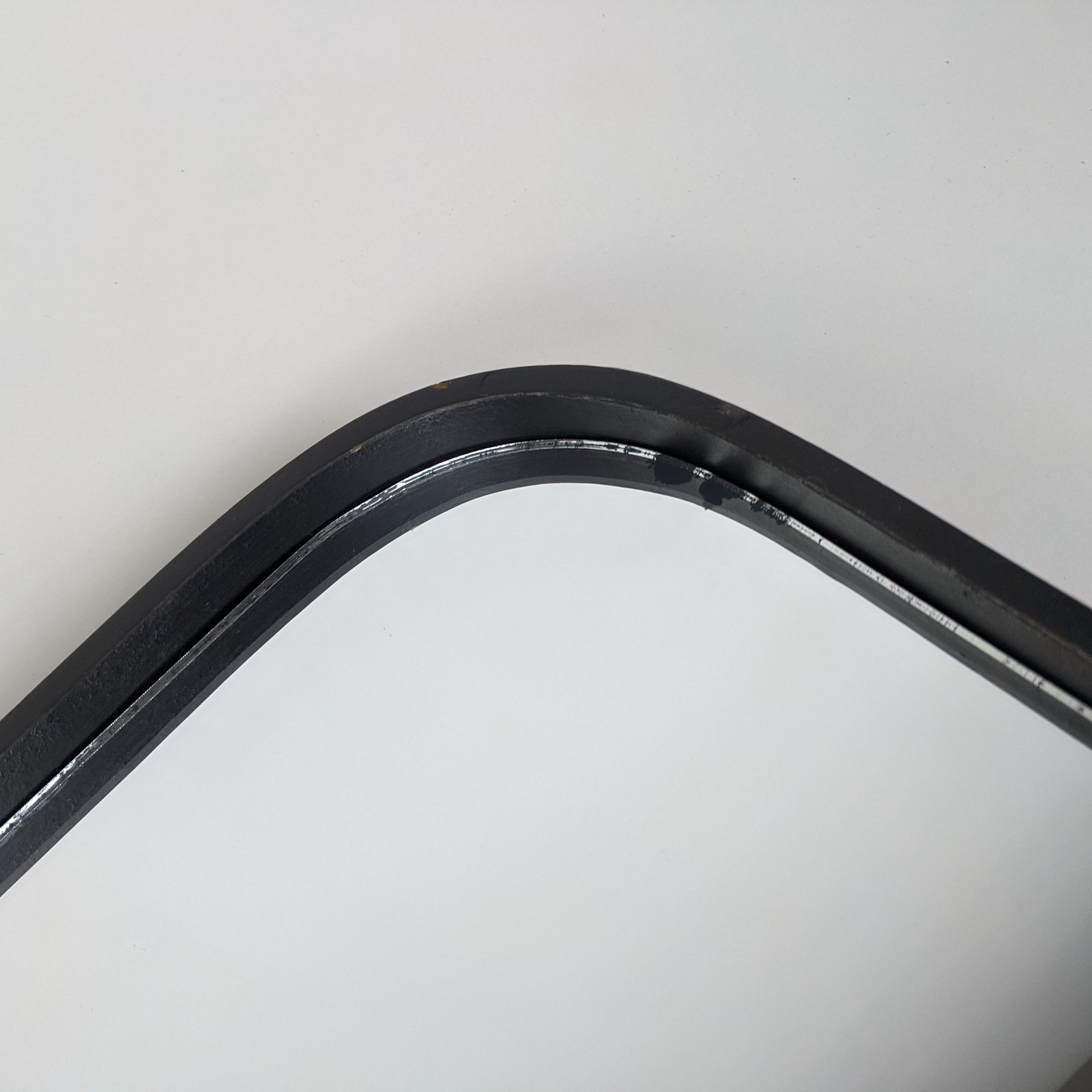 Espejo cuadrado con marco negro de madera y puntas redondeada, con detalles apreciados en las fotos.